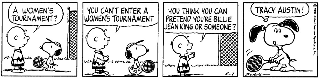 There’s far too many to list here, but top of the list would probably be Peanuts. As a kid I loved Snoopy’s boundless imagination and how he would reinvent himself over and over again! I don’t think I really knew who Billie Jean King was, but it didn’t matter because I was laughing at Snoopy putting his ears in bunches and pretending to be a tennis star! As a grown-up I still revisit Peanuts strips for inspiration!