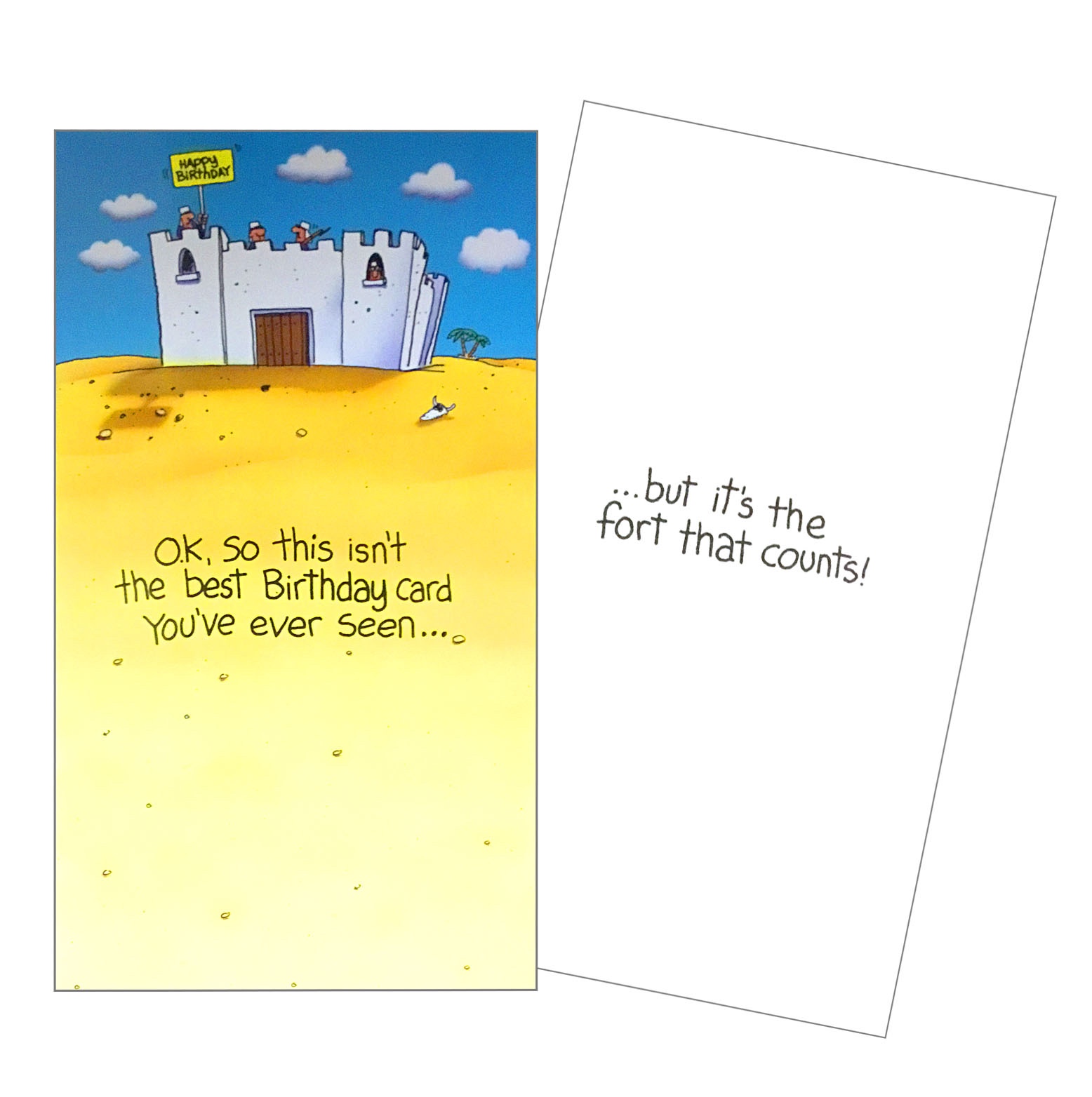 One of my most successful cards featured a fairly simple illustration of a Foreign Legion/Beau Geste fort in the desert. The caption read “Ok, this may not be the best Birthday card you’ve ever had… but it’s the fort that counts!” That earned me several thousand pounds in royalties over the years. Amazing.