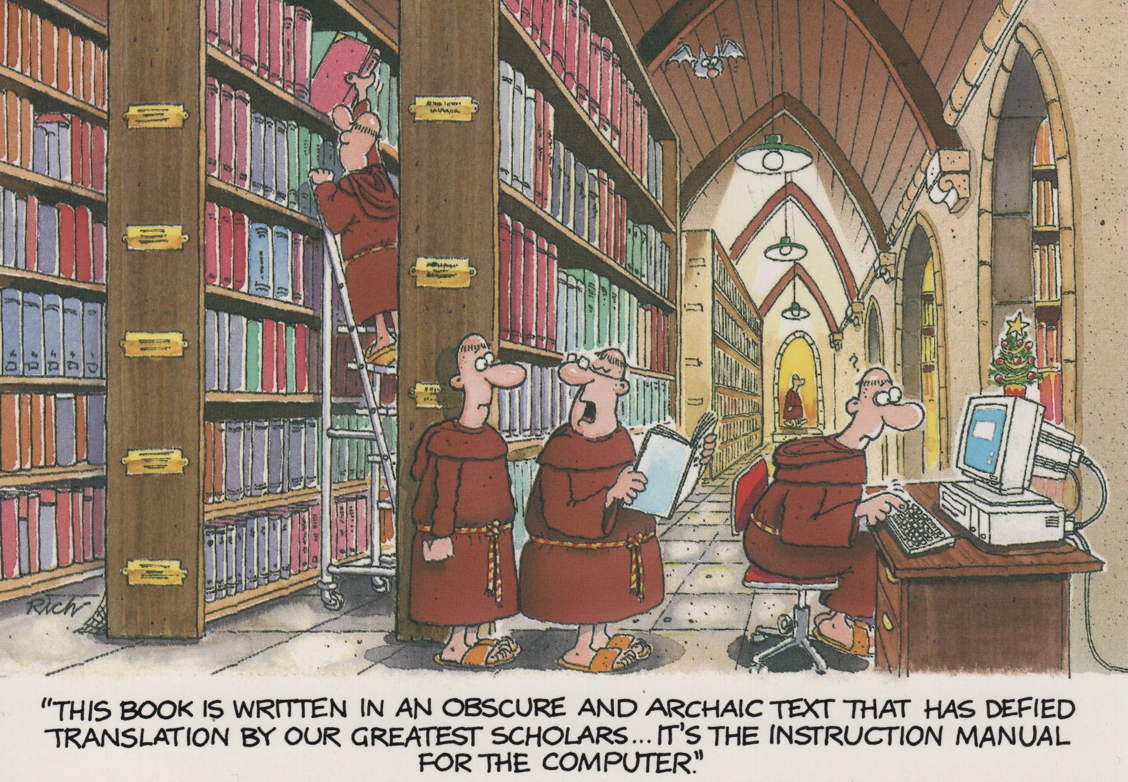 The card samples I was sent were nothing like my style, so I set about doing my own version. It was the dawn of the digital age, with computers just being taken up and used commercially, so I thought it might work if I combined Monks in their medieval setting with modern day computers. I had one Monk labouring over an Illustrated manuscript that read “Merry Christmas” with another Monk producing the same thing a hundred times faster on a computer with a graphics package and a printer.