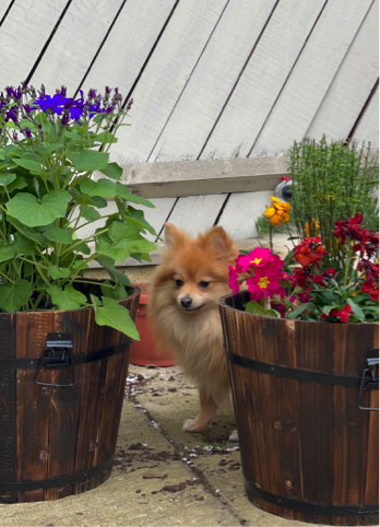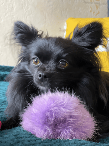 Fluffy loved following me to fill up the water when I’d water the plants, and of course like most doggies, he loved stealing my socks and slippers. So, the inspo for Topsy hiding all the scrunchies in his bed came from Fluffy who still likes to hides socks and slippers in his bed too. Chanel upgraded from chewing on slippers to playing with fluffy-scrunchies!